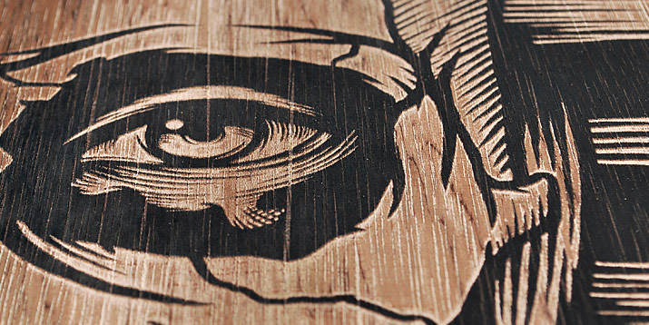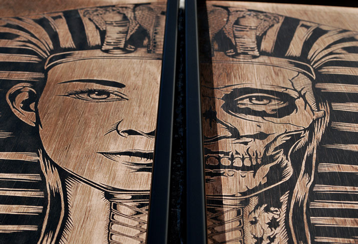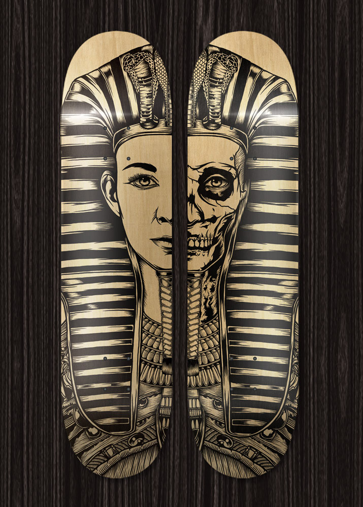 This 2-panel engraving, created for the “Edge of Love” exhibit at the Strychnin Gallery in Berlin shows the female Pharaoh Hatshepsut side-by-side. On the left, she is shown alive and ruling. On the right she, her body is a corpse and her soul has passed on to her afterlife, in which she was both in love, and obsessed with. The wood engraving shows tension and contrast between handcrafted works and those made using digital tools. This piece is also available as a dual skate deck. Click here to get yours now.