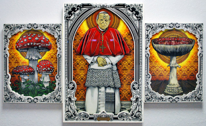 'Mushroom Cult' was created for the 'Serious Sh!t' Art Show and was inspired by John Allegro’s revelation of the role of a sacred mushroom in the ancient religions as well as the documentary 'The Pharmacratic Inquisition'. This piece is a 1of 1 giclée and resin on wood and is available here.